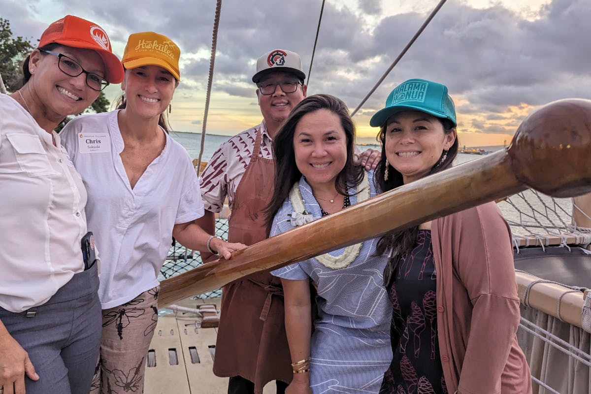 Lia Hunt, Chris Sakuda, Mark Noguchi, Meli James, and Darcie Yukimura aboard the Hōkūleʻa